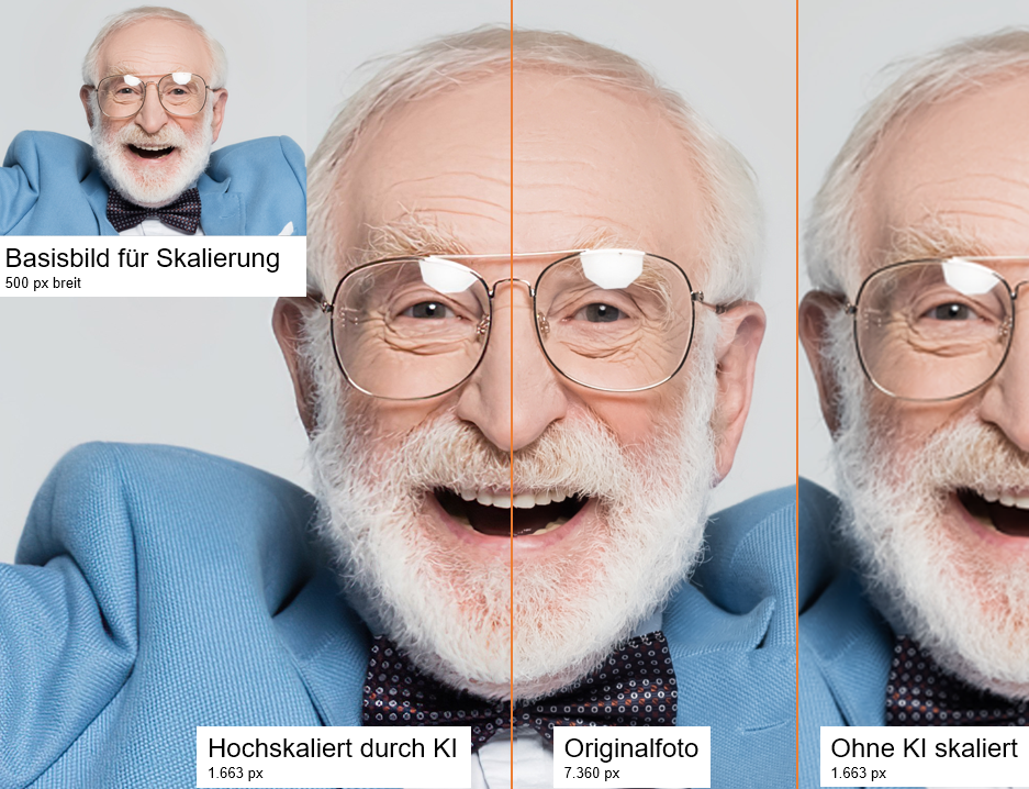 In Zeiten von KI darf man diese Regel nun mittlerweile etwas aufweichen. In einem aktuellen Kundenprojekt standen wir im Zuge eines Relaunch vor der Herausforderung, dass gut 90% der Referenzfotos nur in geringer Auflösung vorlagen. Keins hatte mehr als 500 px in der Breite. Um die Arbeiten modern zu präsentieren, vielleicht sogar in Vollbild in einer Lightbox, also viel zu gering.