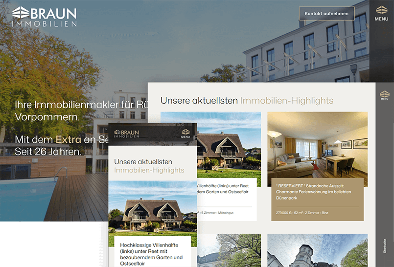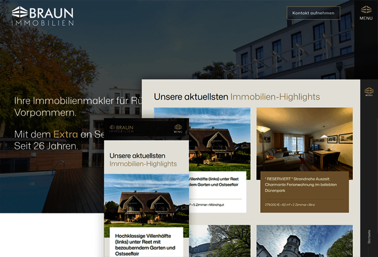 Diese gestalterisch anspruchsvolle TYPO3-Seite haben wir für ein Immoblienmaklerbüro auf Rügen entwickelt. Die Anbindung an die Maklersoftware (Propstack) spart unserem Kunden viel Zeit, weil z.B. Objekte automatisch übertragen werden.