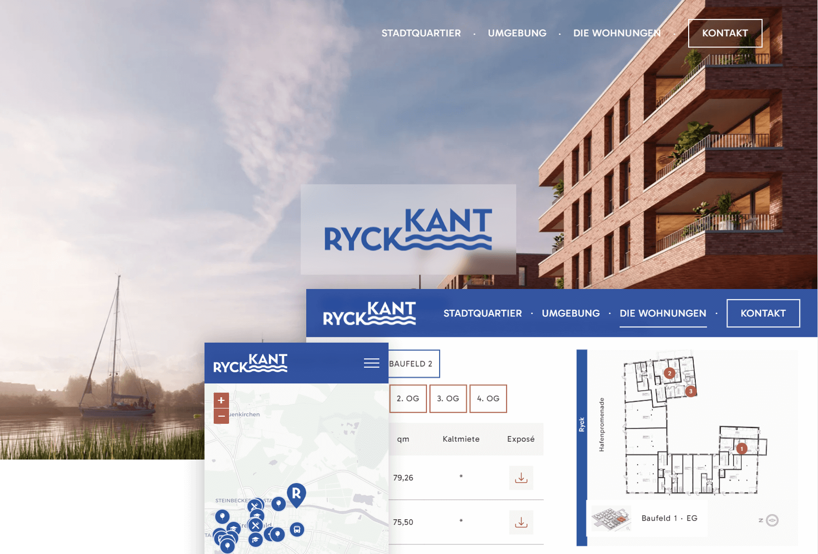 Bei dieser Projektwebsite ging es darum, dass sich in Bau befindliche Wohnquartier direkt am Fluss Ryck in Greifswald ins richtige Licht zu setzen. Es gibt eine übersichtliche Immobiliendatenbank, außerdem können alle 182 Exposés komfortabel betrachtet und heruntergeladen werden. Interessenten haben die Möglichkeit, direkt mit dem Makler in Kontakt zu treten.