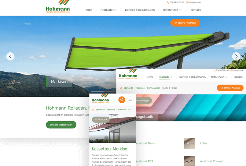 Pünktlich zur Sonnen-Saison haben wir für unseren langjährigen Kunden Hohmann Rollladen Sonnenschutz GmbH einen Relaunch erstellt. Im Zuge der Umsetzung in TYPO3 haben wir u.a. einen Funnel erstellt, der die Nutzerführung für Anfragen erleichtern soll. Ein sehr umfangreicher Referenzbereich mit hunderten Fotos soll dem Interessenten die Auswahl erleichtern.