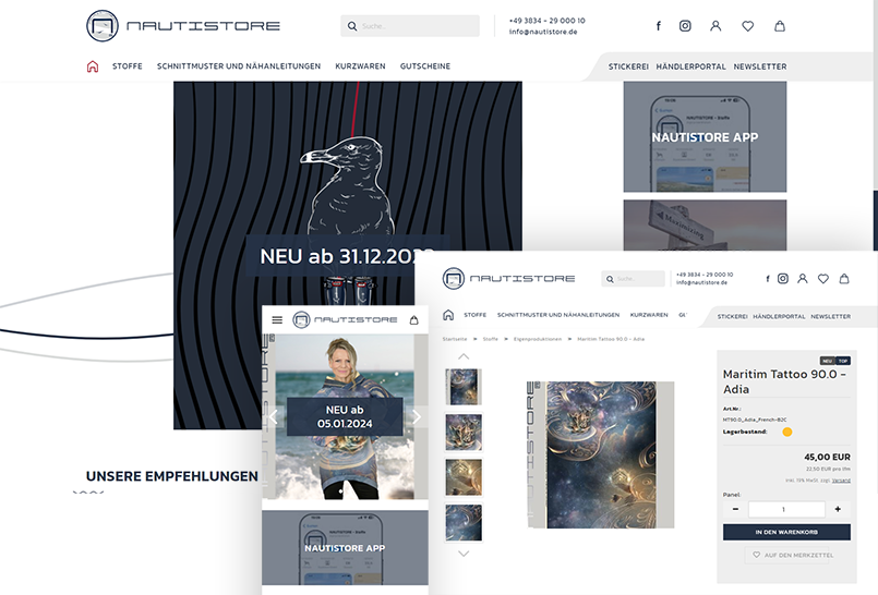 Bei dem Onlineshop von nautistore.de nutzten wir Gambio in der self-hosted Version, um allerhand individuelle Anpassungen vornehmen zu können, grafischer und technischer Natur. Unsere Kundin nutzte vorher WooCommerce in Verbindung mit Wordpress und ist nun glücklich, ein „echtes“ Shop-System nutzen zu können. Vorteil ist u.a. der direkte Draht zum Entwicklerteam von Gambio, was uns viel Flexibilität erlaubt.