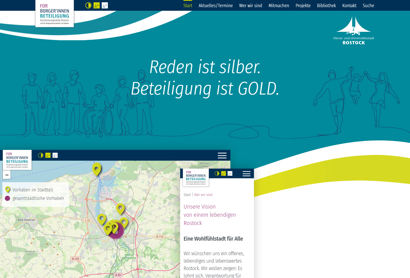 „Reden ist silber. Beteiligung ist GOLD.“, ist das Motto der Internetseite, die wir für die Koordinierungsstelle Rostock erstellt haben. Es geht um Bürgerinnen und Bürgerbeteiligung in der Hansestadt. Ein Highlight ist der interaktive Stadtplan, der die verschiedenen Vorhaben aufzeigt. Außerdem gibt es allerhand gut strukturierte Informationen und Terminübersichten.
